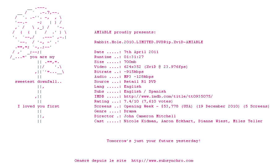 Voir le nfo de la release Rabbit.Hole.2010.LIMITED.DVDRip.XviD-AMIABLE