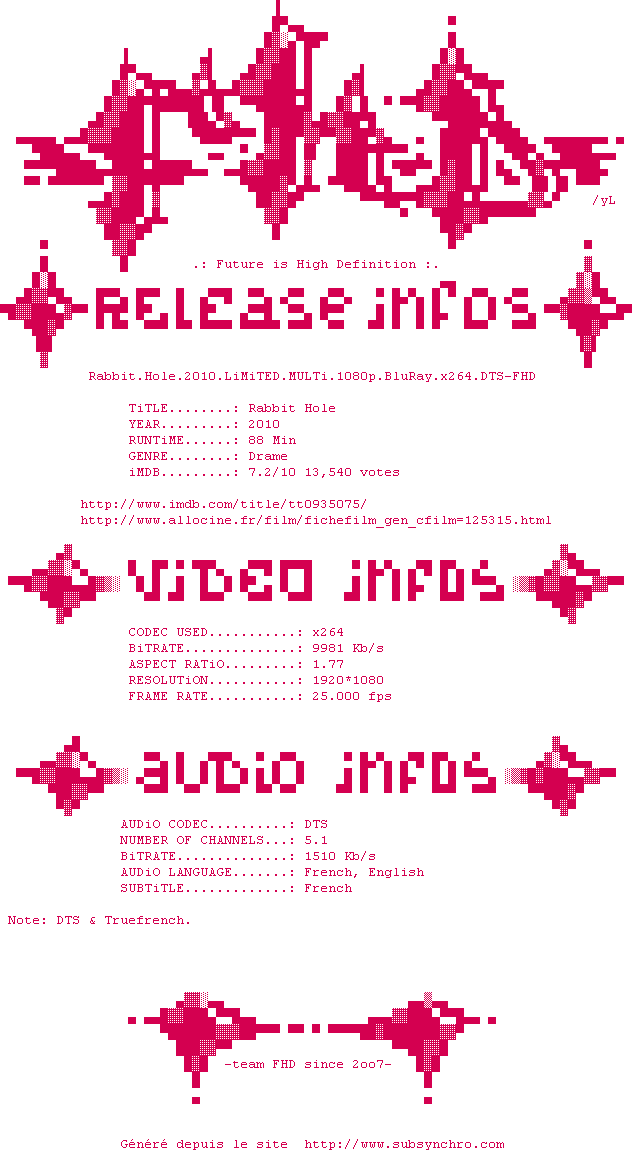 Voir le nfo de la release Rabbit.Hole.2010.LiMiTED.MULTi.1080p.BluRay.x264.DTS-FHD