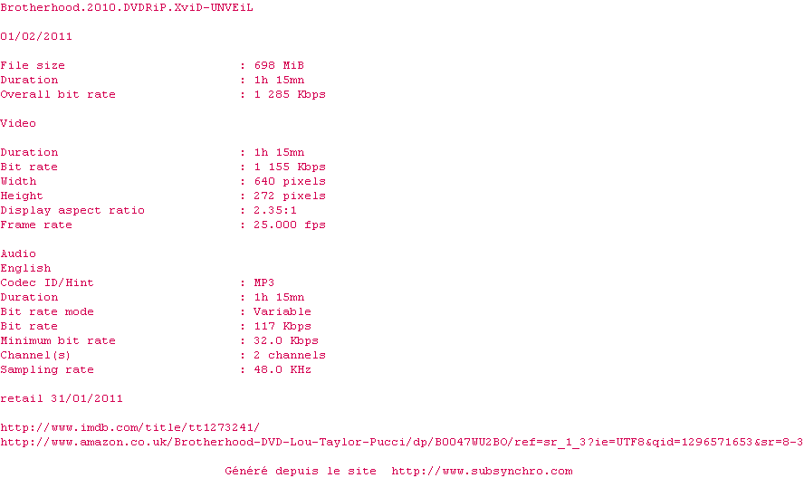 | Voir le nfo de la release Brotherhood.2010.REPACK.1080p.BluRay.x264-KaKa | KaKa | Brotherhood.2010.REPACK.1080p.BluRay.x264-KaKa OpenSubtitles | 0 fichier | ||