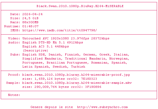 Y avez-vous pense ? Nous proposons déjà 1995 sous-titres pour le film Black Swan. Avez-vous essaye de voir si ces sous-titres etaient compatibles avec cette release ? On vous laisse le soin de tester cela pour nous et de contribuer au site en postant le sous-titre en cas de compatiblite constatee !