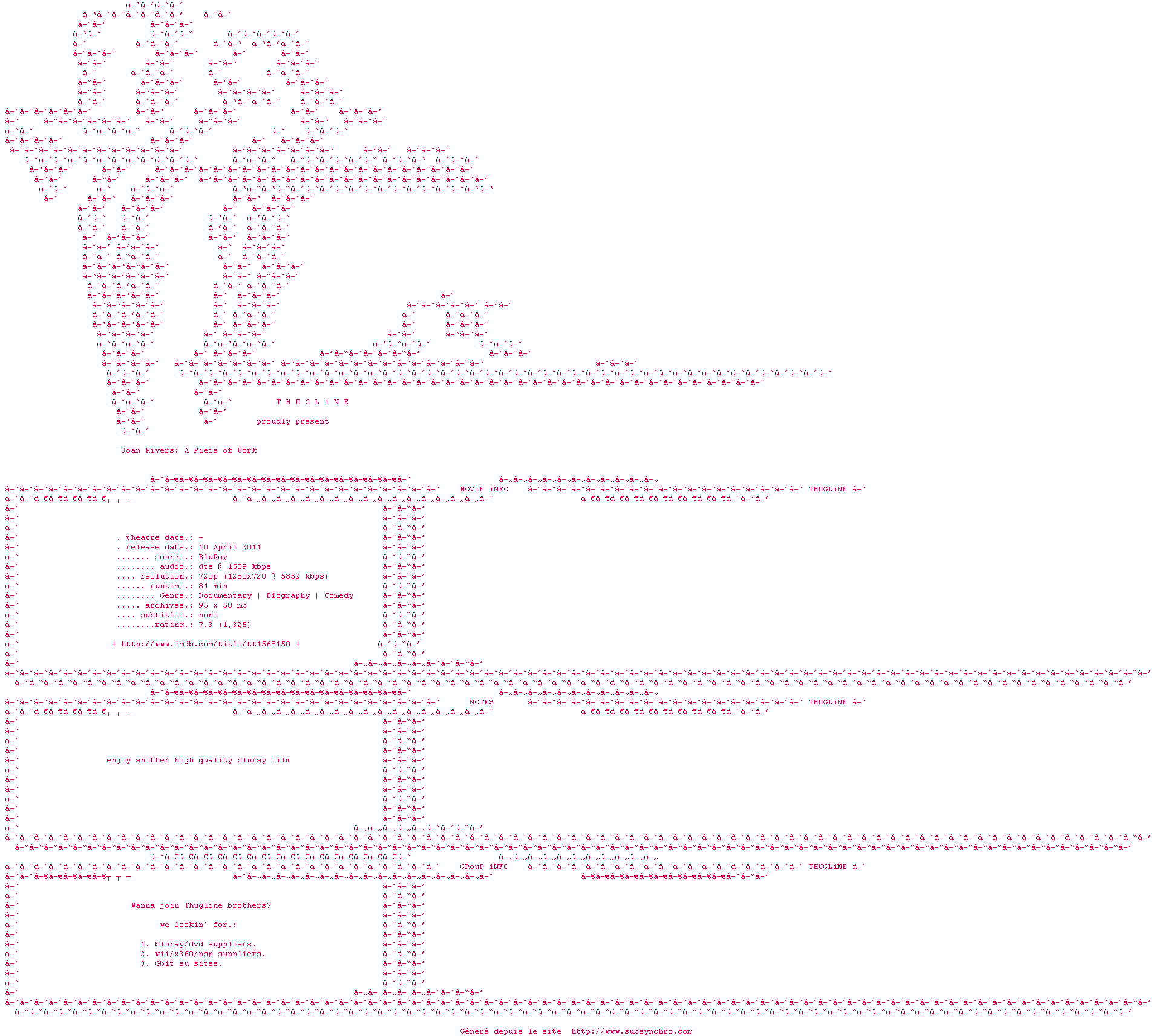 | Voir le nfo de la release Joan.Rivers.A.Piece.Of.Work.2010.720p.BluRay.x264-THUGLiNE | THUGLiNE | Joan.Rivers.A.Piece.Of.Work.2010.720p.BluRay.x264-THUGLiNE OpenSubtitles | 0 fichier |