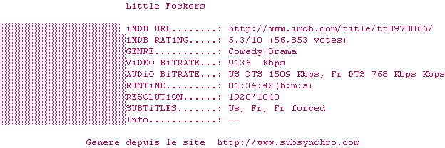 Y avez-vous pense ? Nous proposons déjà 1954 sous-titres pour le film Mon beau-père et nous. Avez-vous essaye de voir si ces sous-titres etaient compatibles avec cette release ? On vous laisse le soin de tester cela pour nous et de contribuer au site en postant le sous-titre en cas de compatiblite constatee !