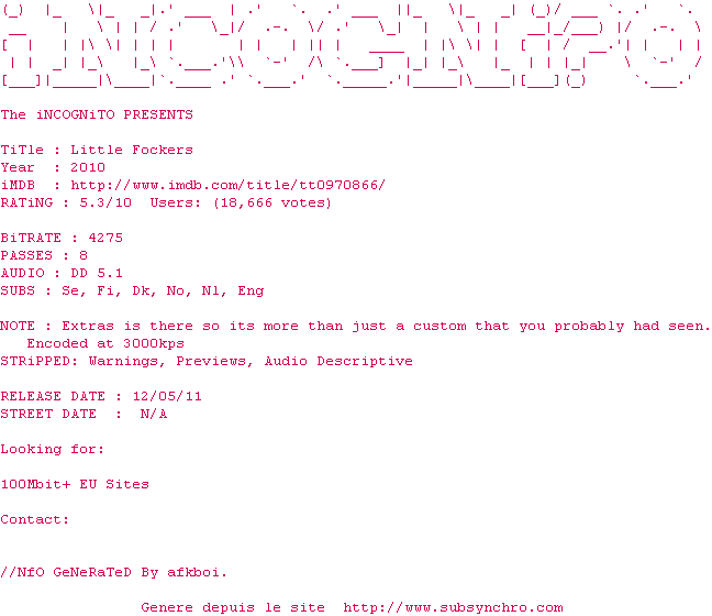 Y avez-vous pense ? Nous proposons déjà 1954 sous-titres pour le film Mon beau-père et nous. Avez-vous essaye de voir si ces sous-titres etaient compatibles avec cette release ? On vous laisse le soin de tester cela pour nous et de contribuer au site en postant le sous-titre en cas de compatiblite constatee !