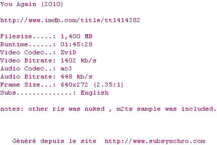 Voir le nfo de la release You.Again.2010.720p.BluRay.X264.DTS-HDChina