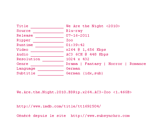 Voir le nfo de la release We.Are.the.Night.2010.BDRip.x264.AC3-Zoo