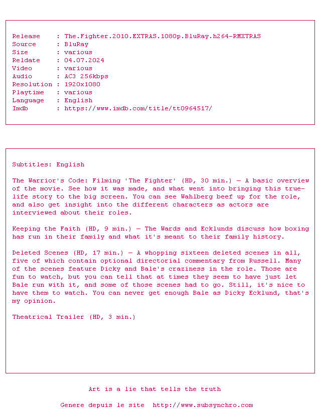 Voir le nfo de la release The.Fighter.2010.EXTRAS.1080p.BluRay.H264-RMXTRAS