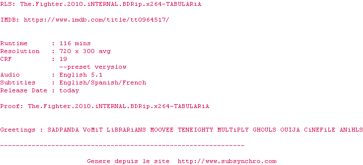 Voir le nfo de la release The.Fighter.2010.iNTERNAL.BDRip.x264-TABULARiA