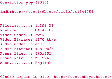 Voir le nfo de la release Conviction.2010.BRRip.XviD-ExtraTorrentRG