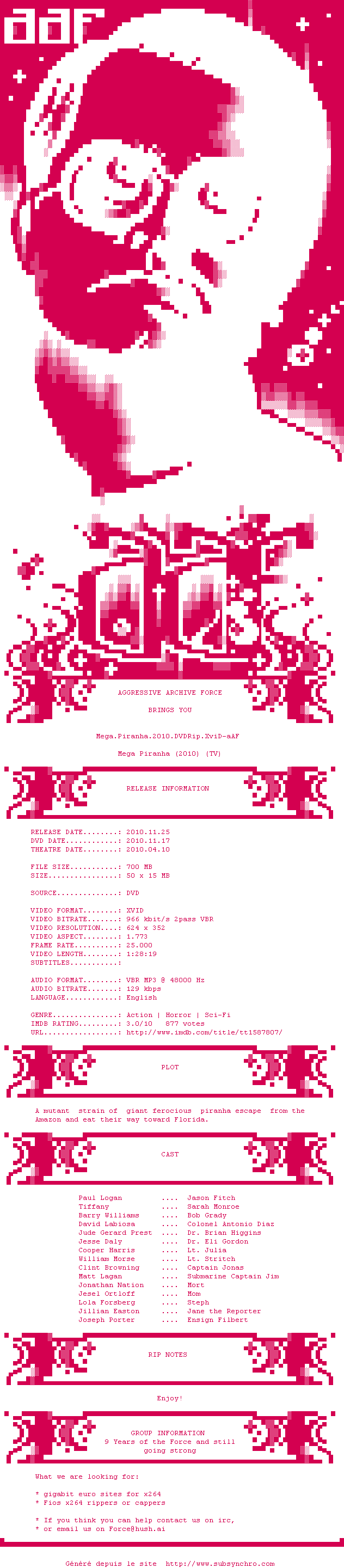 | Voir le nfo de la release Mega.Piranha.2010.DVDRip.XviD-aAF | aAF | Mega.Piranha.2010.DVDRip.XviD-aAF OpenSubtitles | 0 fichier | ||