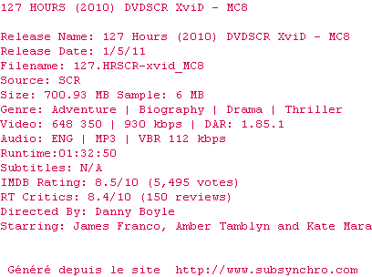 Voir le nfo de la release 127.Hours.2010.DVDSCR.XViD-MC8