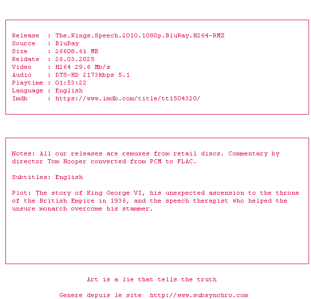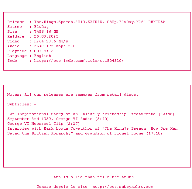 Voir le nfo de la release The.Kings.Speech.2010.EXTRAS.1080p.BluRay.H264-RMXTRAS