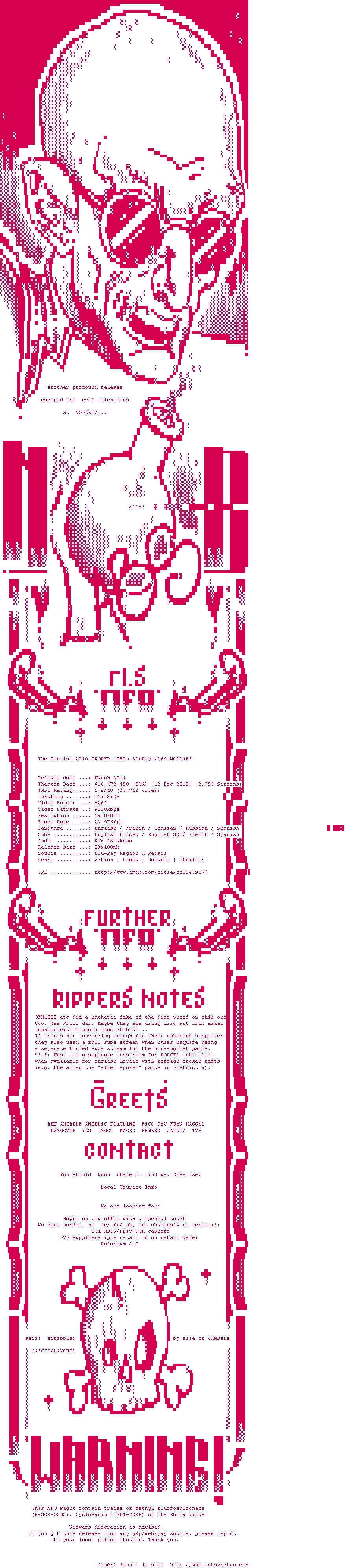 Voir le nfo de la release The.Tourist.2010.PROPER.1080p.BluRay.x264-NODLABS