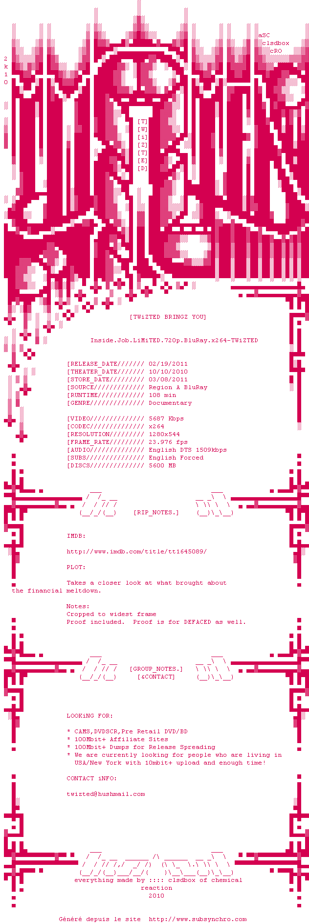Voir le nfo de la release Inside.Job.LiMiTED.720p.BluRay.x264-TWiZTED