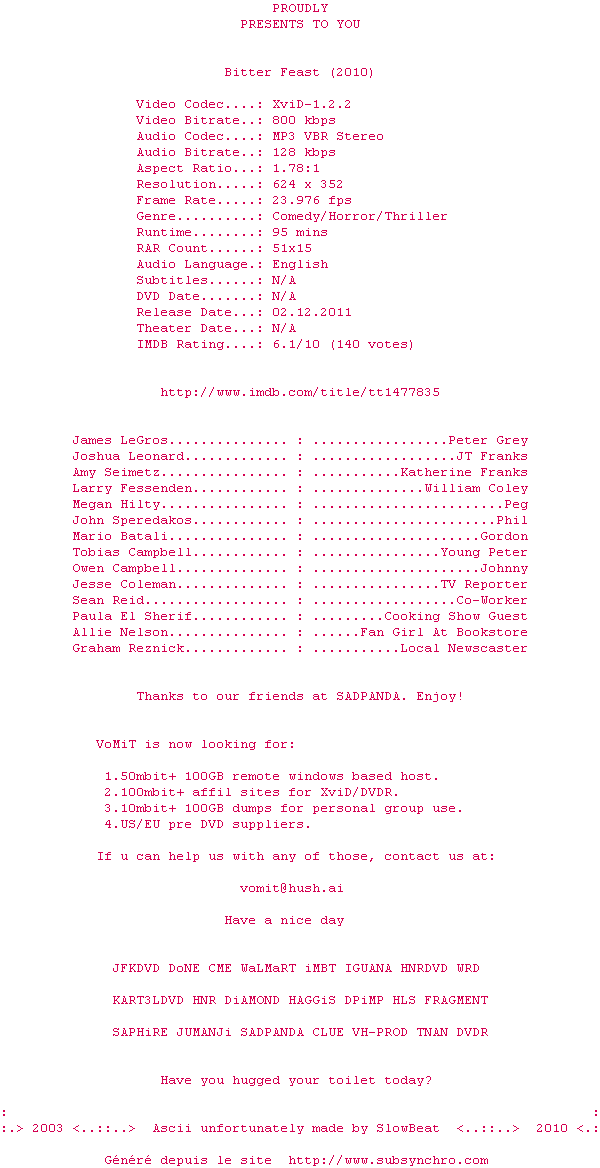 Voir le nfo de la release Bitter.Feast.2010.DVDRip.XviD-VoMiT