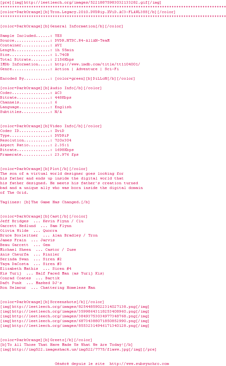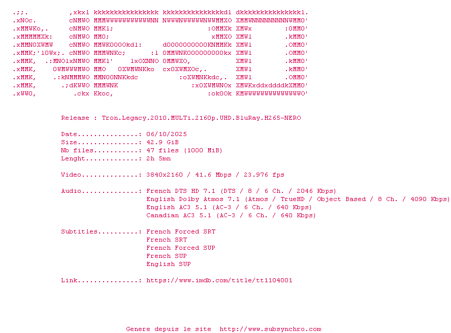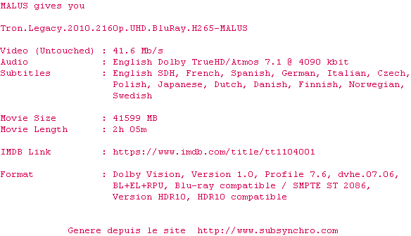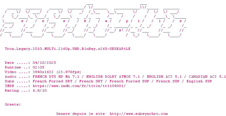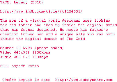 La suite du culte TRON ne déçoit pas un instant. L'univers du premier est très bien adapté aux progrès de le technologie et le scénario est plutôt original.