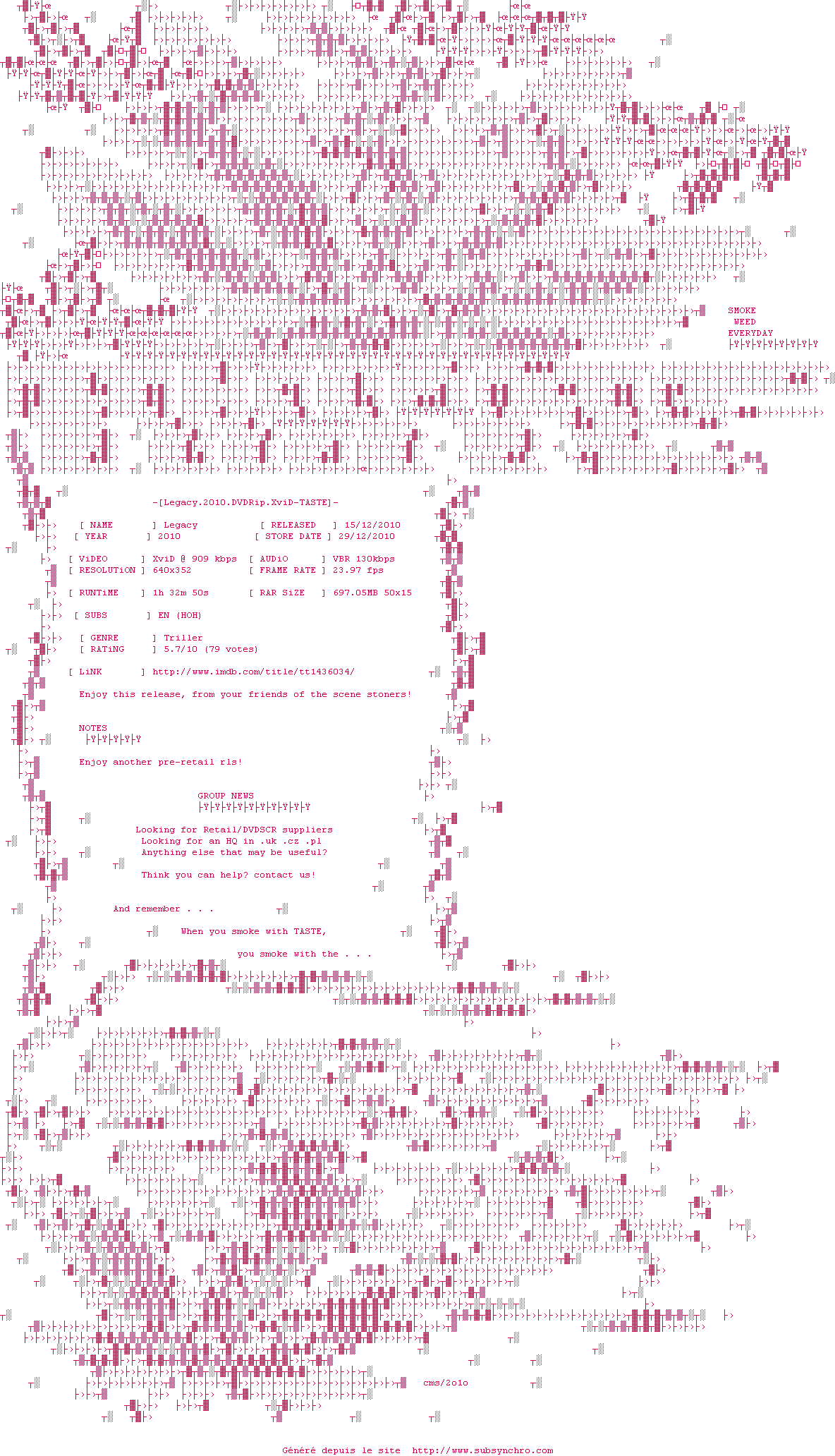 Voir le nfo de la release Legacy.2010.RERIP.DVDRip.XviD-TASTE