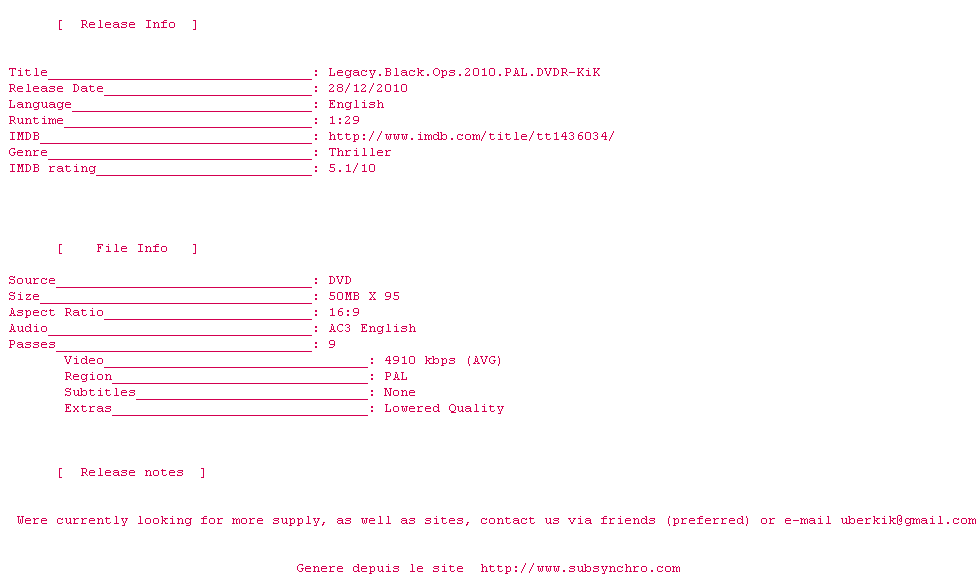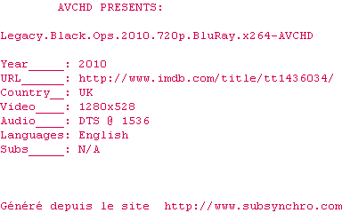 Voir le nfo de la release Legacy.Black.Ops.2010.1080p.BluRay.x264-AVCHD