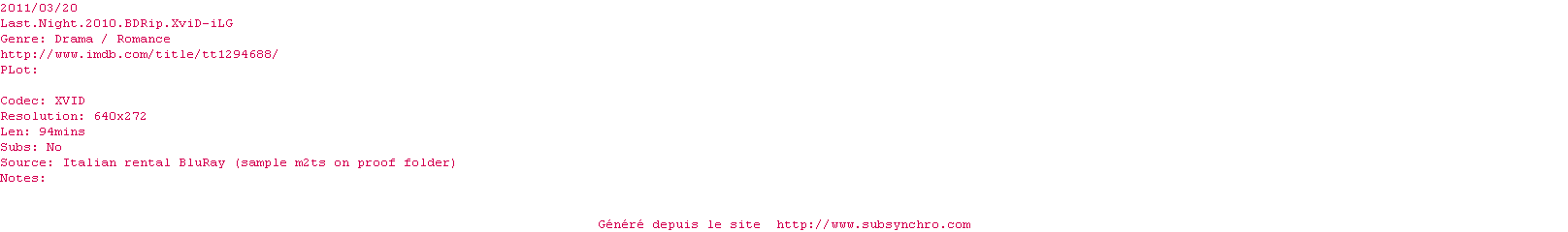 Voir le nfo de la release Last.Night.2010.BDRip.XviD-iLG