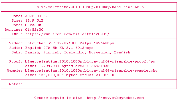 Y avez-vous pense ? Nous proposons déjà 1197 sous-titres pour le film Blue Valentine. Avez-vous essaye de voir si ces sous-titres etaient compatibles avec cette release ? On vous laisse le soin de tester cela pour nous et de contribuer au site en postant le sous-titre en cas de compatiblite constatee !