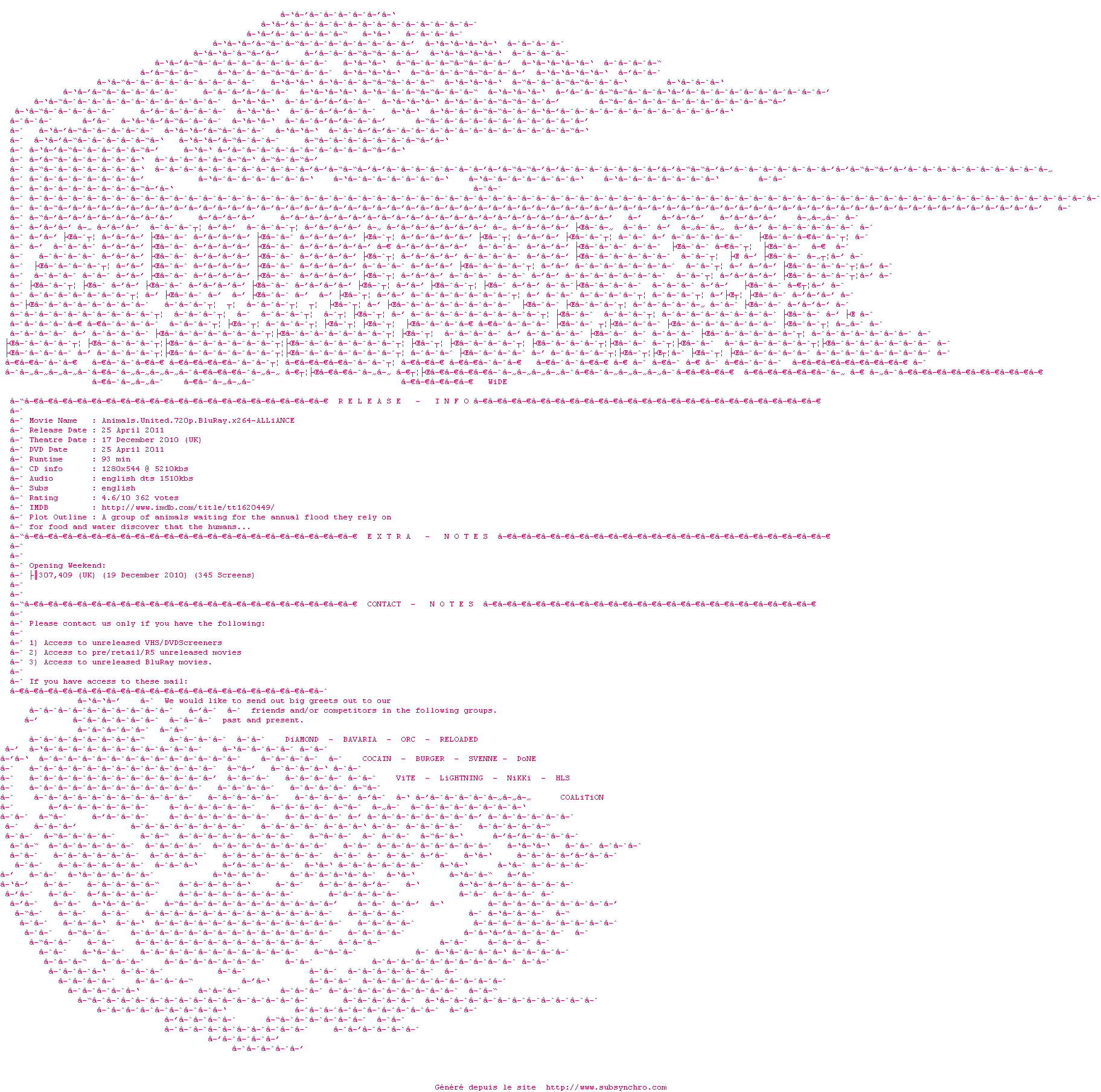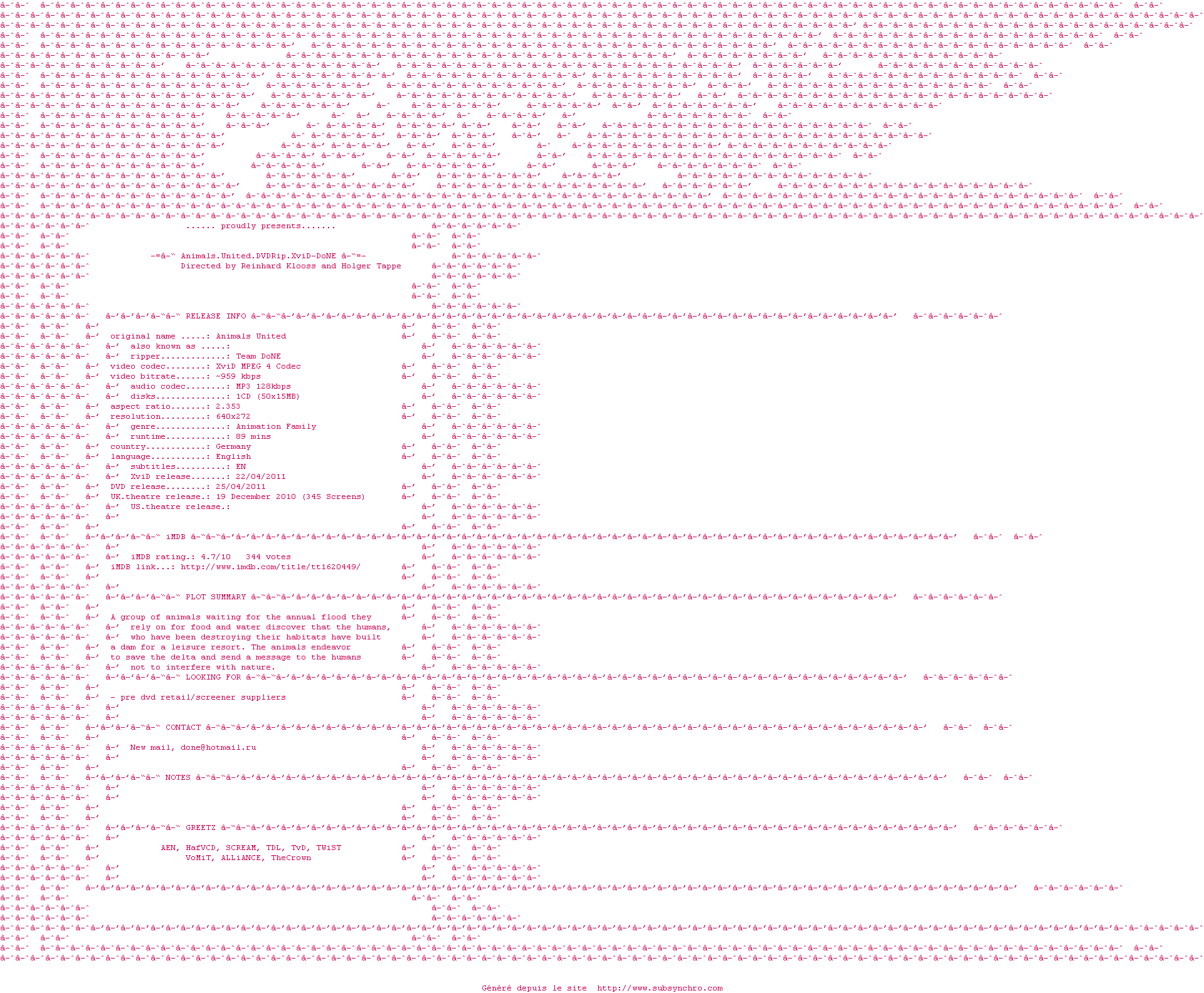 Le commentaire de Yaumegui Commente par Yaumegui (554), Le Lundi 23 Novembre 2015 à 14h56 Animé pseudo écologique qui donne envie de polluer tellement l'attaque contre les hommes est ridicule et outrancière. Le scénario est à pleurer, au début j'ai cru que c'était une suite de sketchs sur les désastres écologiques provoqués par l'homme. Tout est pompé sur Madagascar et L'Âge de glace, même les doublages, mon fils au bout de 5 minutes me l'a fait remarqué. C'est dommage, quelques gags et les moyens mis dans l'animation qui plutôt bonne auraient pu permettre de passer un message intéressant. 0.5 / 10 0 0