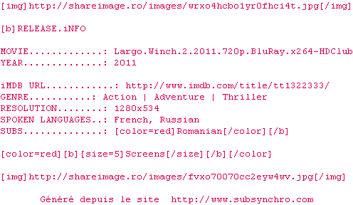 Voir le nfo de la release Largo.Winch.2.2011.720p.BluRay.x264-HDCLUB