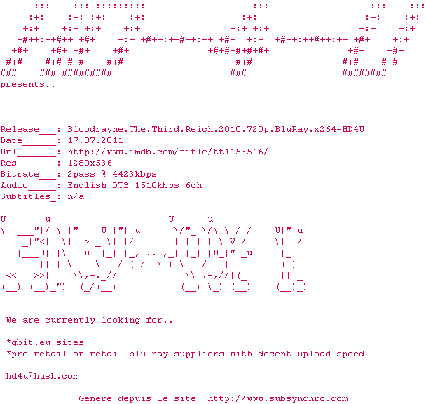 Voir le nfo de la release Bloodrayne.The.Third.Reich.2010.720p.BluRay.x264-HD4U
