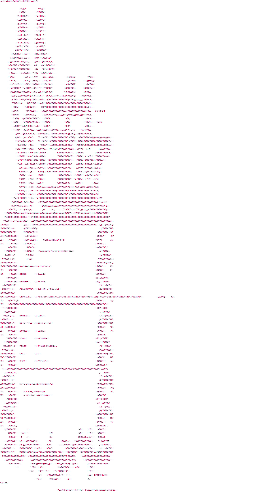Voir le nfo de la release Brothers.Justice.2010.1080p.BluRay.x264-VETO
