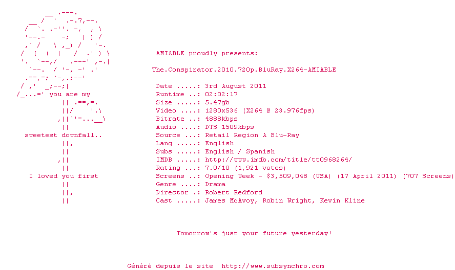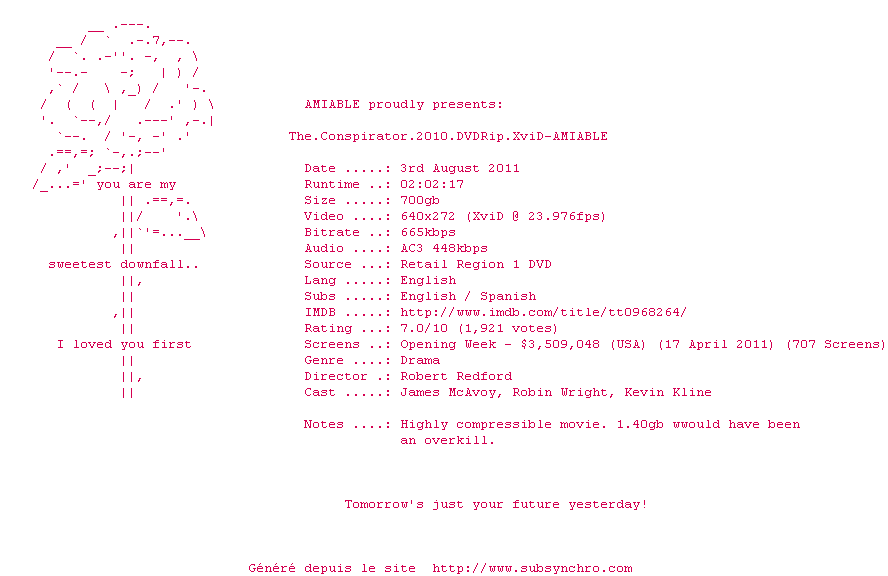 | Voir le nfo de la release The.Conspirator.2010.DVDRip.XviD-AMIABLE | AMIABLE | The.Conspirator.2010.DVDRip.XviD-AMIABLE OpenSubtitles | 10/12/2011 | 1 fichier | |
