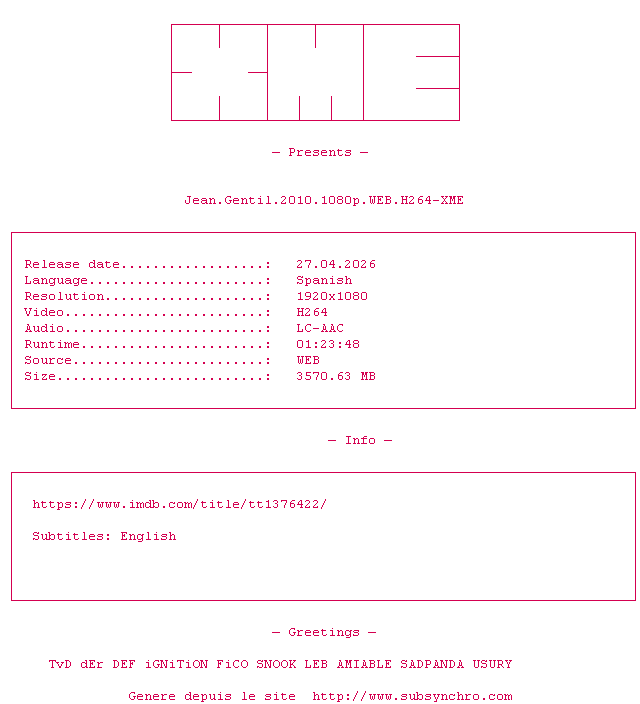 Y avez-vous pense ? Nous proposons déjà 2124 sous-titres pour le film Jean Gentil. Avez-vous essaye de voir si ces sous-titres etaient compatibles avec cette release ? On vous laisse le soin de tester cela pour nous et de contribuer au site en postant le sous-titre en cas de compatiblite constatee !