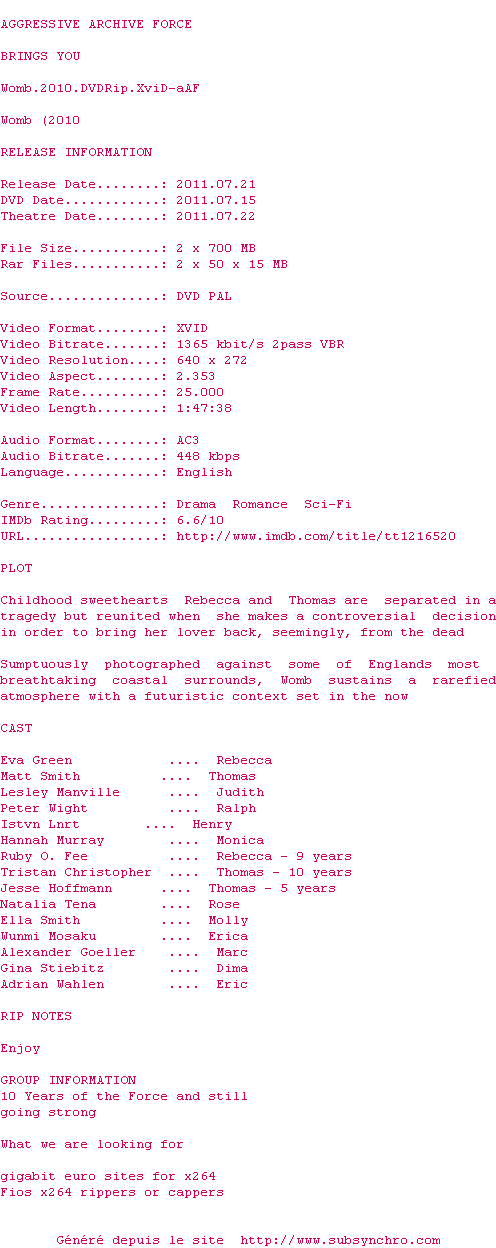 | Voir le nfo de la release Womb.2010.DVDRip.XviD-aAF | aAF | Womb.2010.DVDRip.XviD-aAF OpenSubtitles | 0 fichier | ||