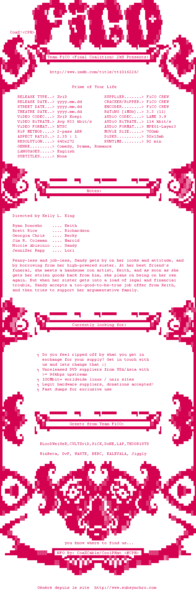 Voir le nfo de la release Prime.Of.Your.Life.2010.DVDRip.XviD-FiCO