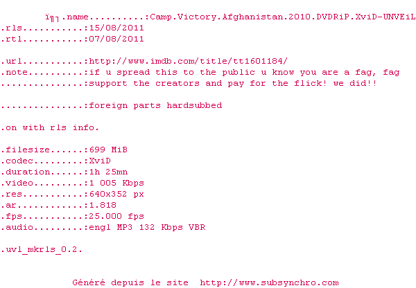 Voir le nfo de la release Camp.Victory.Afghanistan.2010.DVDRiP.XviD-UNVEiL