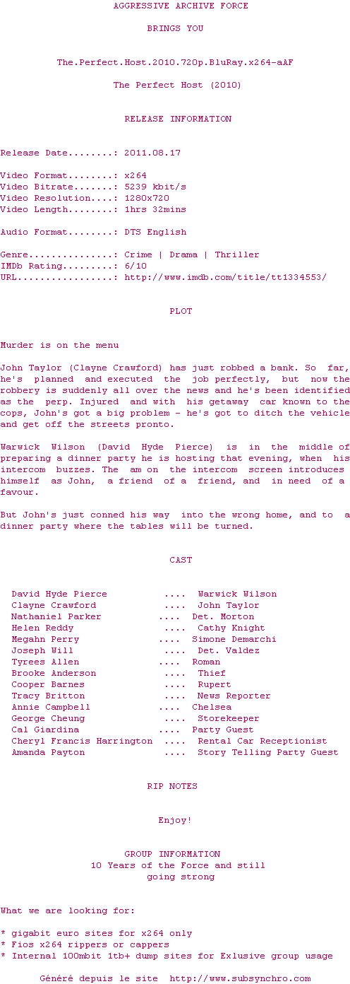 | Voir le nfo de la release The.Perfect.Host.2010.BDRip.XviD-aAF | aAF | The.Perfect.Host.2010.BDRip.XviD-aAF OpenSubtitles | 0 fichier |