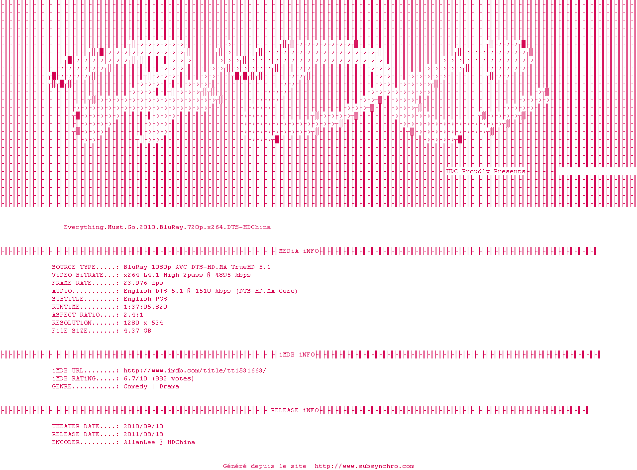 Voir le nfo de la release Everything.Must.Go.2010.BluRay.720p.x264.DTS-HDChina