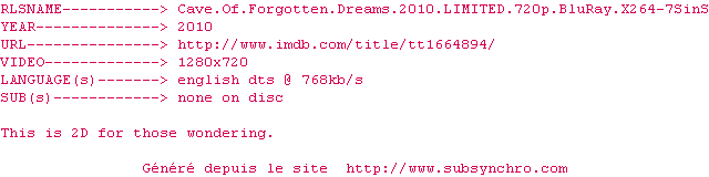 Voir le nfo de la release Cave.Of.Forgotten.Dreams.2010.LIMITED.720p.BluRay.X264-7SinS