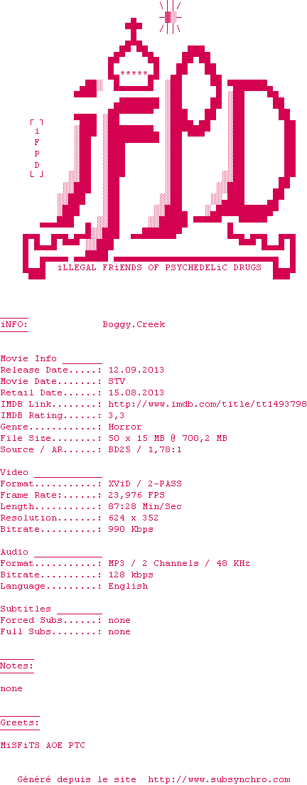 Voir le nfo de la release Boggy.Creek.2010.720p.BluRay.x264-iFPD