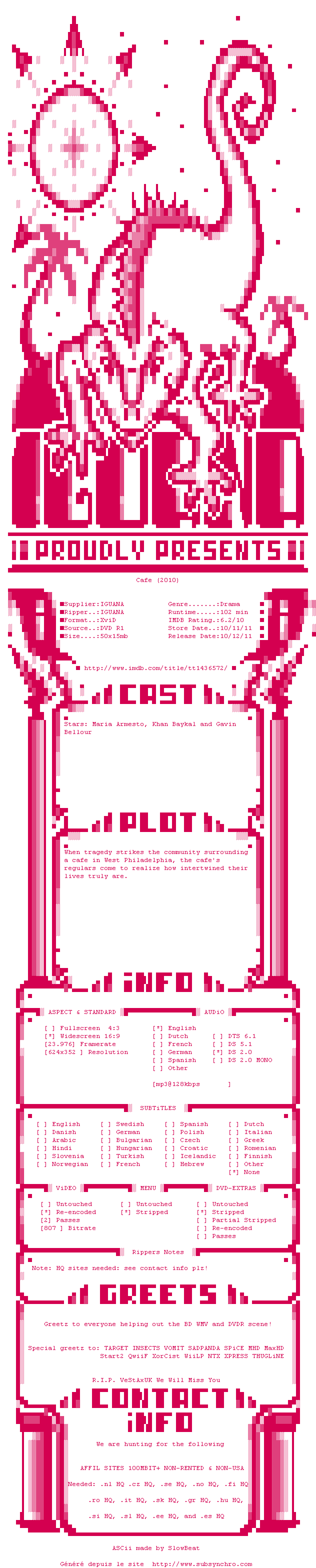 Voir le nfo de la release Cafe.2010.DVDRip.XviD-IGUANA