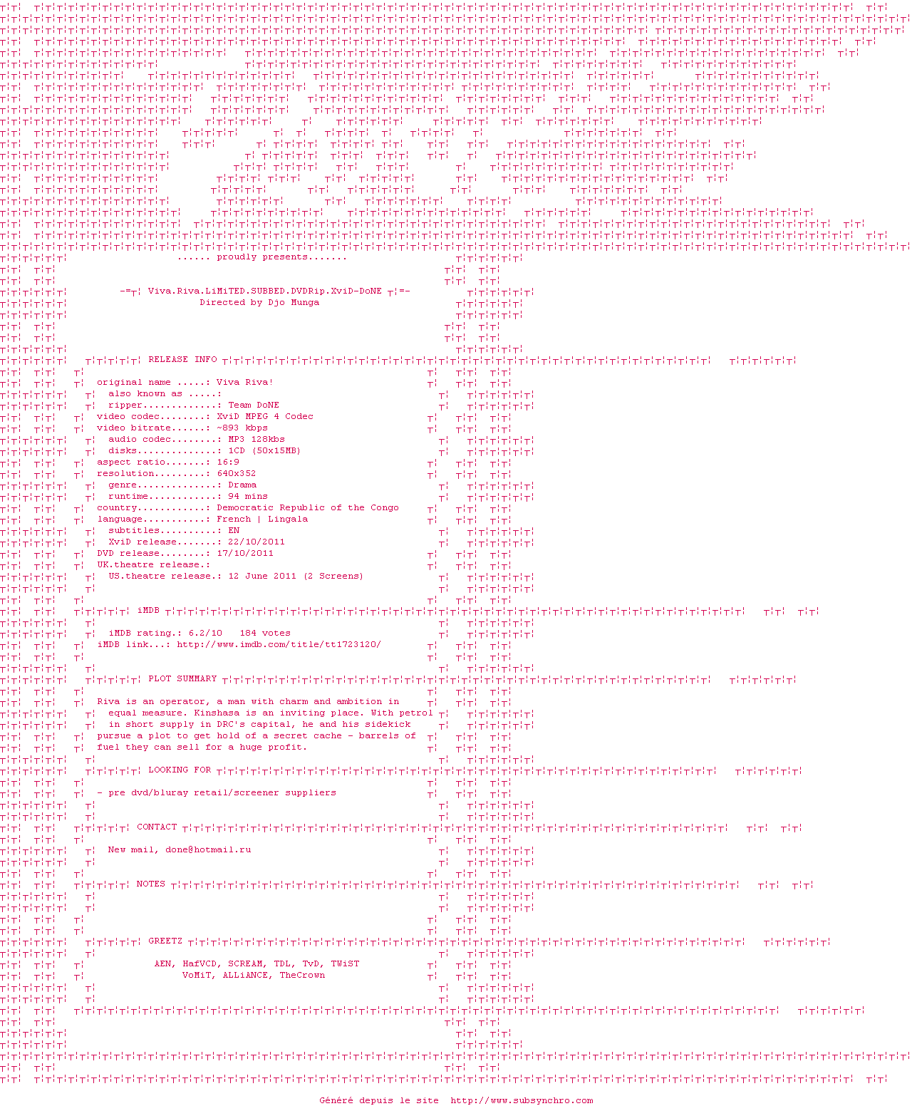 | Voir le nfo de la release Viva.Riva.LiMiTED.SUBBED.DVDRip.XviD-DoNE | DoNE | Viva.Riva.LiMiTED.SUBBED.DVDRip.XviD-DoNE OpenSubtitles | 0 fichier | ||