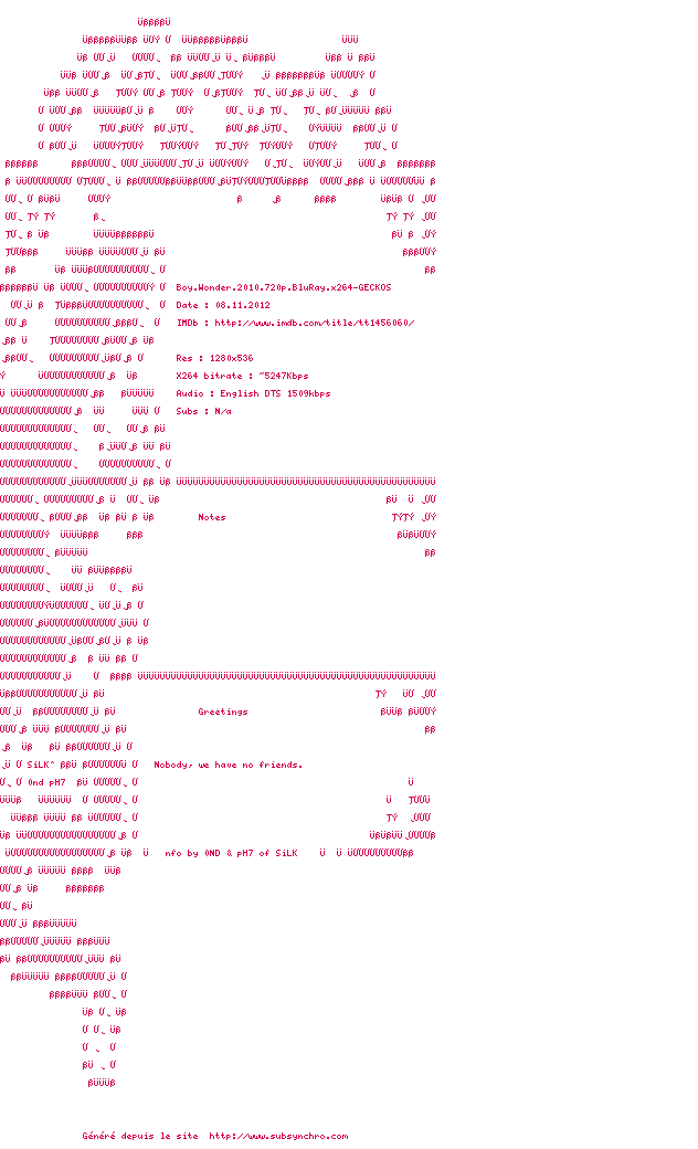Voir le nfo de la release Boy.Wonder.2010.1080p.BluRay.x264-GECKOS