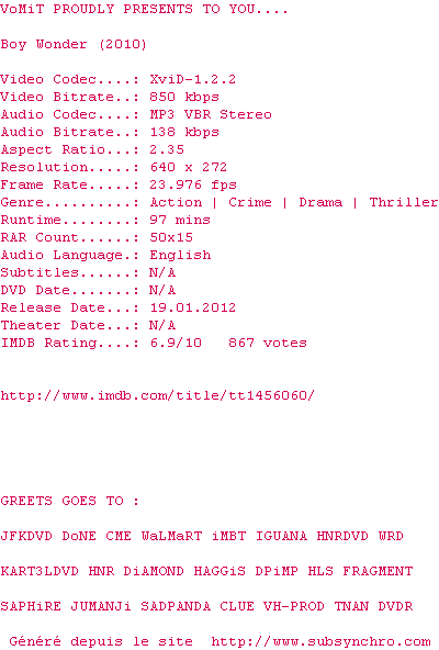 Voir le nfo de la release Boy.Wonder.2010.DVDRip.XviD-VoMiT