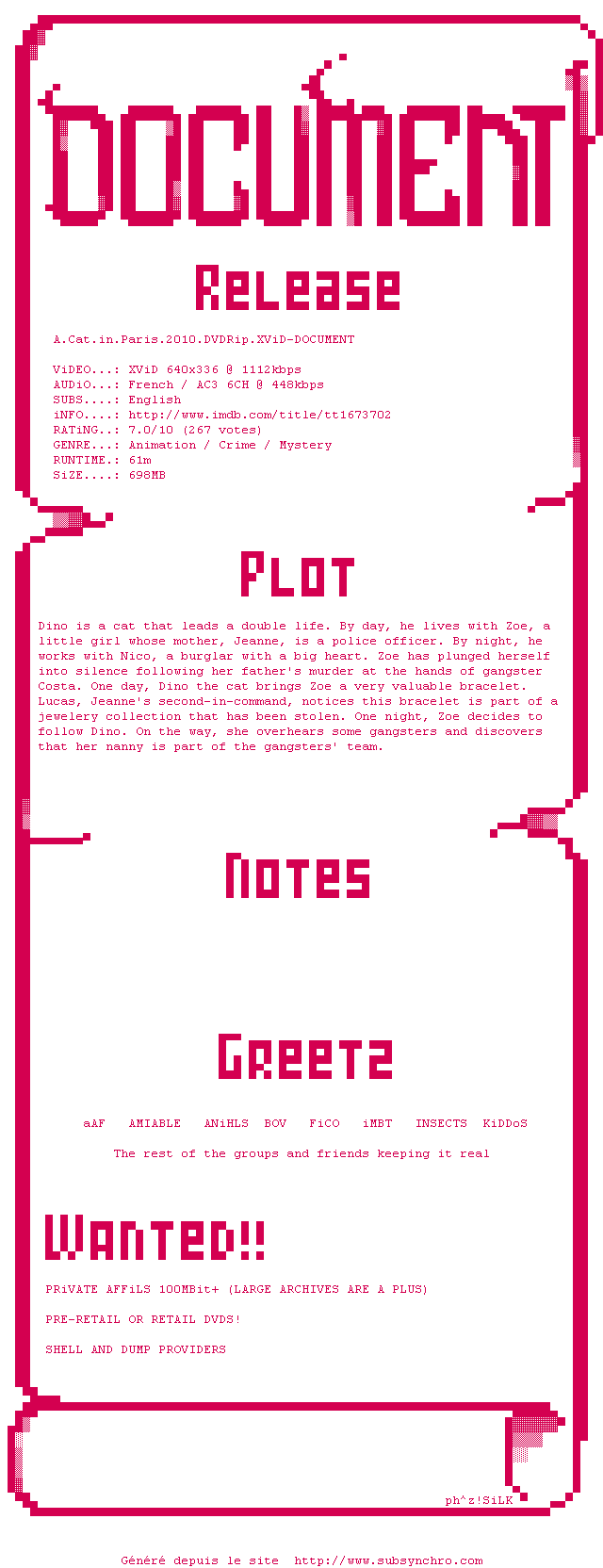 | Voir le nfo de la release A.Cat.in.Paris.2010.DVDRip.XViD-DOCUMENT | DOCUMENT | A.Cat.in.Paris.2010.DVDRip.XViD-DOCUMENT OpenSubtitles | 0 fichier | ||