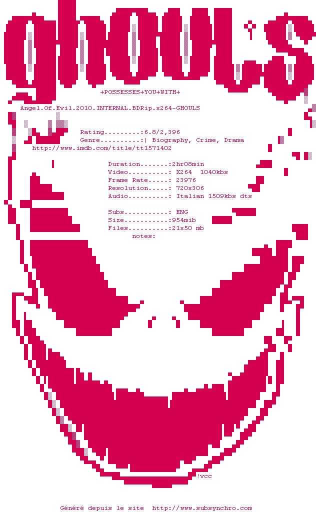 Voir le nfo de la release Angel.Of.Evil.2010.iNTERNAL.BDRip.x264-GHOULS