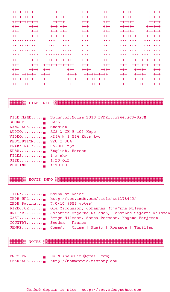 | Voir le nfo de la release Sound.of.Noise.2010.DVDRip.x264.AC3-BAUM | BAUM | Sound.of.Noise.2010.DVDRip.x264.AC3-BAUM OpenSubtitles | 0 fichier | ||
