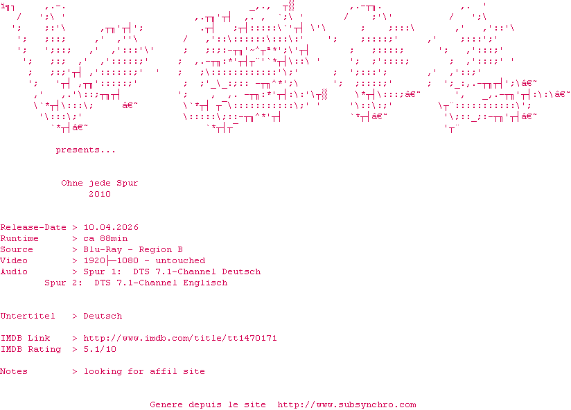Y avez-vous pense ? Nous proposons déjà 1563 sous-titres pour le film Mystérieuse Disparition / Ohne jede Spur. Avez-vous essaye de voir si ces sous-titres etaient compatibles avec cette release ? On vous laisse le soin de tester cela pour nous et de contribuer au site en postant le sous-titre en cas de compatiblite constatee !