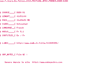 Y avez-vous pense ? Nous proposons déjà 1 sous-titre pour le film 7 Days. Avez-vous essaye de voir si ces sous-titres etaient compatibles avec cette release ? On vous laisse le soin de tester cela pour nous et de contribuer au site en postant le sous-titre en cas de compatiblite constatee !