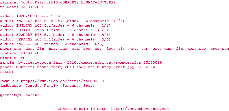 Voir le nfo de la release Tooth.Fairy.2010.COMPLETE.BLURAY-BUTTLERZ