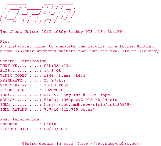 Voir le nfo de la release The.Ghost.Writer.2010.1080p.BluRay.DTS.x264-CtrlHD