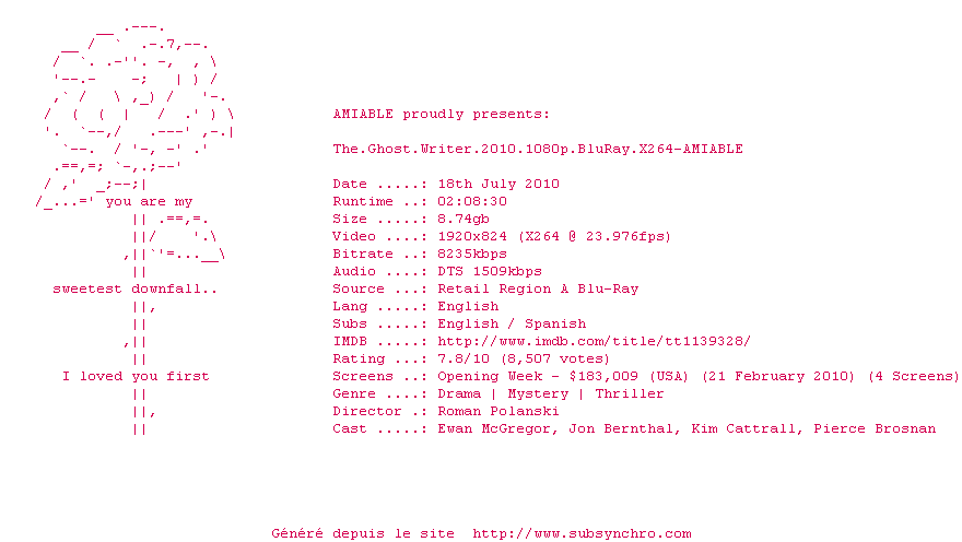 Voir le nfo de la release The.Ghost.Writer.2010.1080p.BluRay.X264-AMIABLE