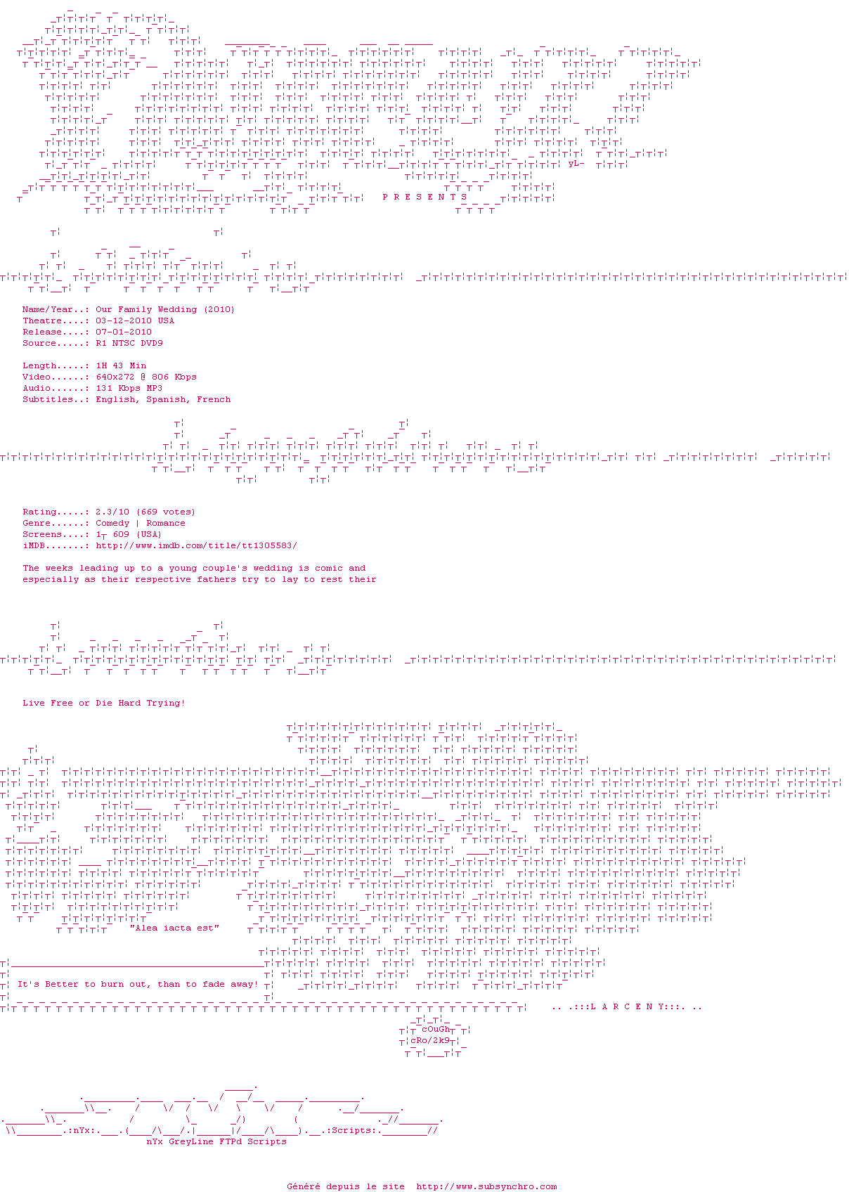 | Voir le nfo de la release Our.Family.Wedding.2010.DVDRip.XviD-Larceny | Larceny | Our.Family.Wedding.2010.DVDRip.XviD-Larceny OpenSubtitles | 02/07/2010 | 1 fichier | |