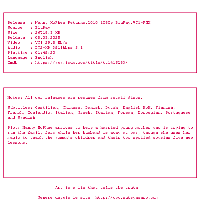 Voir le nfo de la release Nanny.McPhee.Returns.2010.1080p.BluRay.VC1-RMX